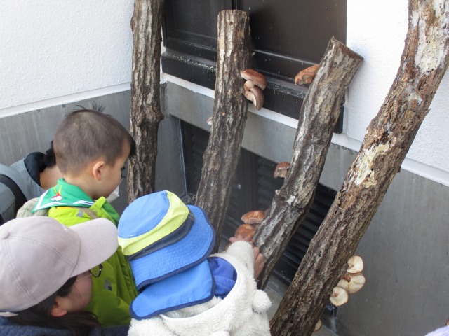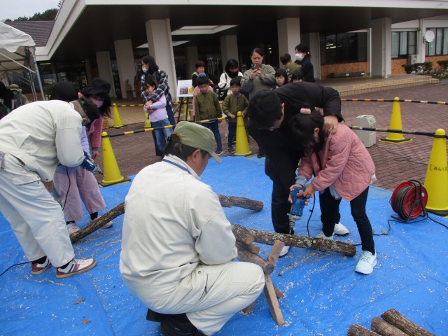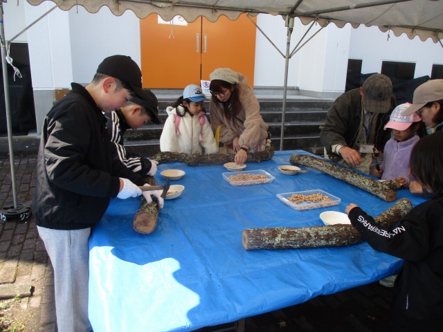 - 荒神山公園管理事務所との共催事業です。しいたけの種菌打ちやもぎ取り体験ができます。荒神山公園の自然を生かした体験活動です。